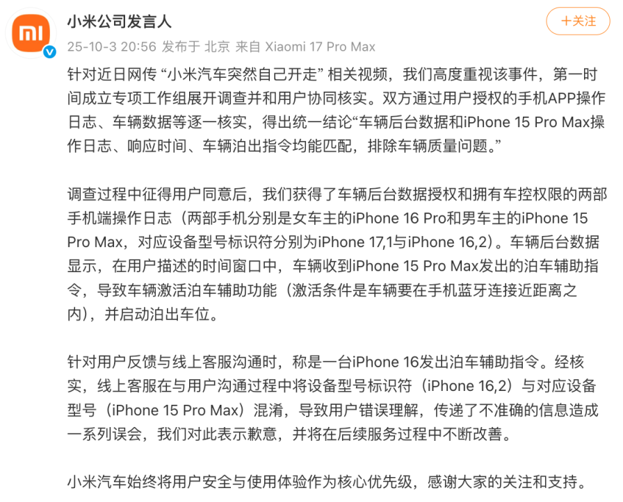 针对近日网传 “小米汽车突然自己开走” 相关视频,我们高度重视该事件,第一时间成立专项工作组展开调查并和用户协同核实。双方通过用户授权的手机APP操作日志、车辆数据等逐一核实,得出统一结论“车辆后台数据和iPhone 15 Pro Max操作日志、响应时间、车辆泊出指令均能匹配,排除车辆质量问题。”