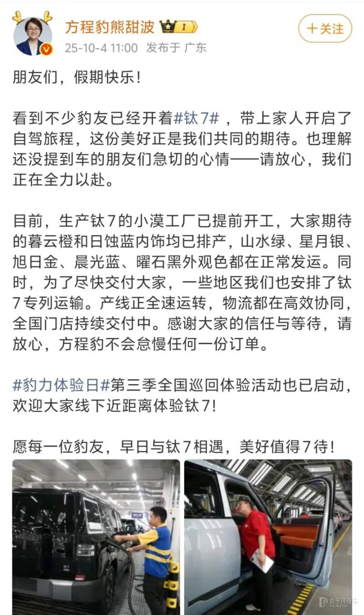 10月4日,方程豹事业部总经理熊甜波发文透露,生产钛7的小漠工厂已提前开工,大家期待的暮云橙和日蚀蓝内饰均已排产。此外,为了加快交付,方程豹还在一些地区安排了钛7专列运输。