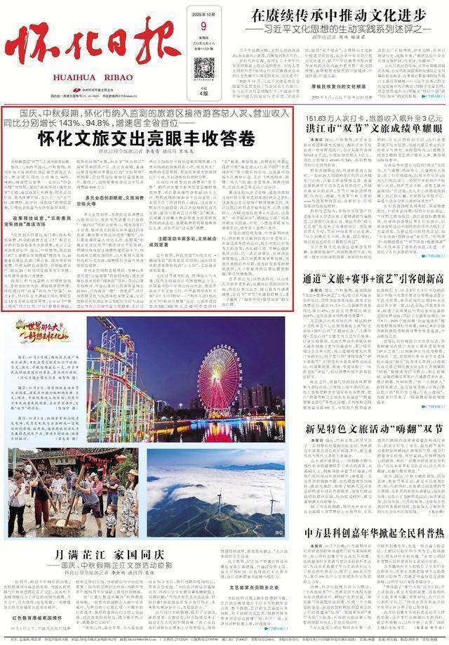 国庆、中秋假期,怀化市纳入监测的旅游区接待游客总人次、营业收入同比分别增长143%、94.8%,增速居全省首位——